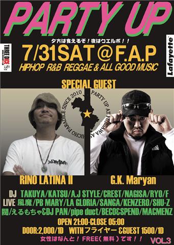 皆さん夏を楽しんでますか~? 昼間は海、夜はclubって感じでこの夏を遊び倒したい人にはグッドな情報ですよ~! おまけにHIP HOP好きならたまらないイベントが今週末土曜に開催されます! 日本のHIP HOPを支えてきたあの2人がなんと藤沢に到来!! 生のLiveを肌で感じるまたとないチャンス! 必見です!!! そして女子は入場無料フリーで入れちゃいます!! 男子は絶対来るべし!! 今週末土曜の藤沢はヤバいですよ~!! 7/31 (土)@CLUB.F.A.P HIPHOP, R&B, REGGAE and ALL GOOD BLACK MUSIC PARTY!! PARTY UP ~夕方は食えるぞ!夜はクエルボ!!~ SPECIAL GUEST RINO LATINA II G.K. Maryan DOOR(当日)2000円/1D WITH フライヤー&GUEST 1500/1D 女性はなんと!FREE(無料)です!! DJ TAKUYA KATSU A.J STYLE CREST NAGISA RYO F LIVE 風魔 PB MARY LA GLORIA SANGA KENZERO SHU-Z 閥 INXIDENCE pipe duct BECO&SPEND MACMENZ 【風魔インフォメーション】 「風魔」着歌配信サイト(全キャリア対応、無料試聴アリ) http://search.icj.jp/ViewArtist.aspx?guid=ON&sid=3&artistid=A-008555 PC用配信サイト(無料試聴アリ)http://monstar.fm/fuma/ 風魔BLOG(携帯対応) http://fuma.kakurezato.com/ 風魔試聴(PCのみ) http://www.myspace.com/fuma134 CLUB.F.A.P http://www.club-fap.com/ PR |
